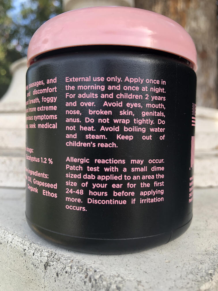 Enhanced natural rub-on solution for chest and soreness from body congestion, labored breathing, sleep, and low energy. Generous long lasting supply of concentrated salve using proprietary methods of packing multiplied power into an already time proven decongestant active ingredients schedule. Formula goes to work immediately leaving no slippery mess on skin since it penetrates into rather than linger on the skin surface. One 8 ounce jar contains alot of 'a little goes a long way'!
